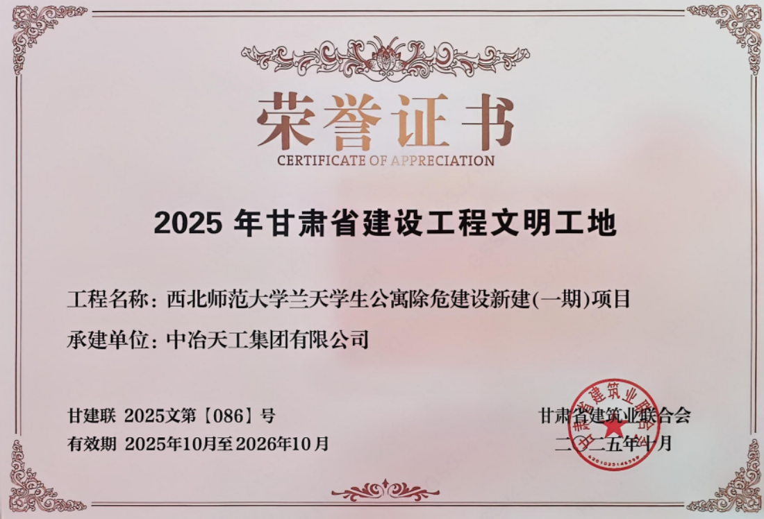 近日,城建公司西北師范大學蘭天學生公寓除危建設新建(一期)項目,憑借規范有序的現場管理、整潔優美的施工環境、扎實有力的文明舉措,成功獲評“甘肅省建設工程文明工地”榮譽稱號。