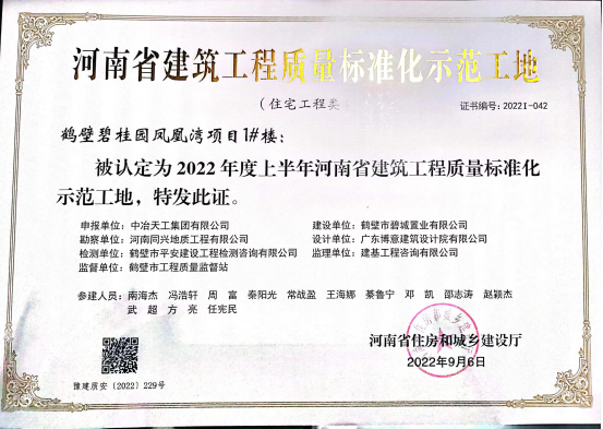 11月4日,天津有限公司鶴壁碧桂園項目獲評2022年度上半年河南省建筑工程質量標準化示范工地。