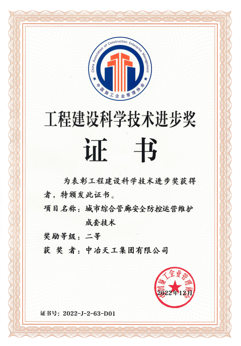 城市综合管廊安全防控运营维护成套技术获得工程建设科学技术进步二等奖