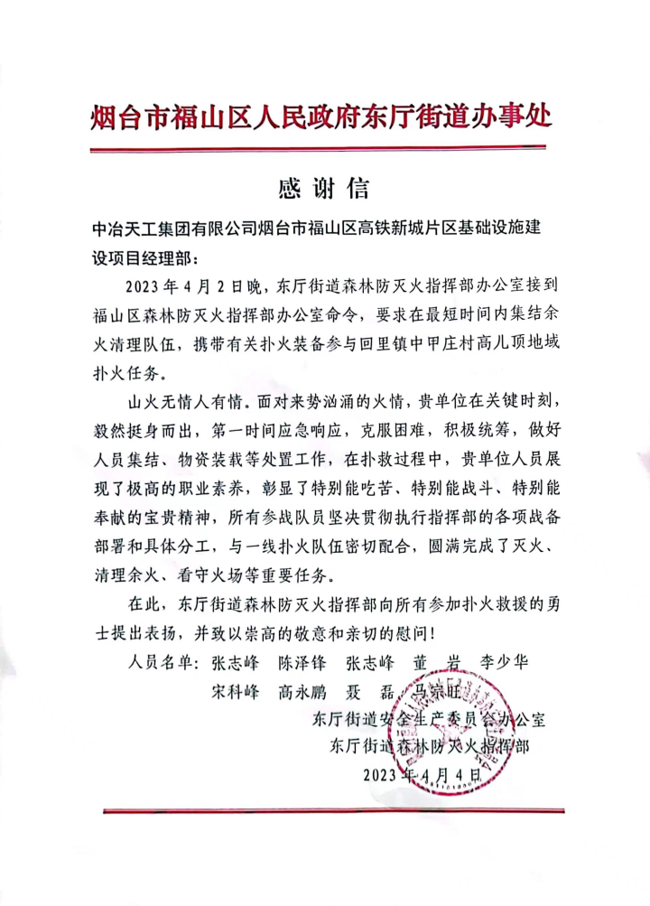 4月6日,渤海公司煙臺市福山區(qū)高鐵新城片區(qū)基礎(chǔ)設(shè)施建設(shè)項(xiàng)目部收到煙臺市福山區(qū)人民政府東廳街道送來的感謝信,對項(xiàng)目部聞令而動、迅速集結(jié)、趕赴現(xiàn)場,開展滅火救援行動表示感謝。