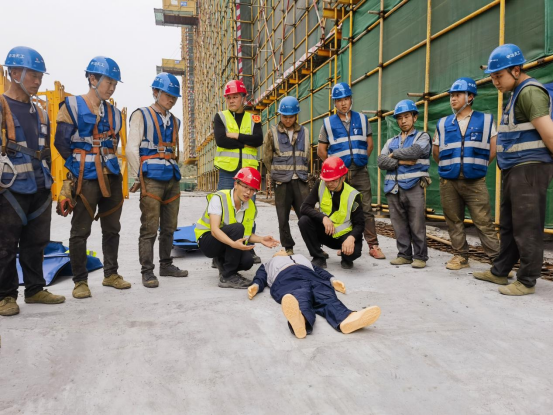 項目部根據演練流程,選擇在高空作業較密集的施工現場,模擬了施工人員不慎從高處墜落的情景,現場專職安全員第一時間向應急救援領導小組組長報告,迅速啟動應急救援預案。各應急小組接到指令后迅速趕往事故現場,醫療救護組進行簡單的醫療檢查,演示了骨折固定及傷口包扎方法;安全警戒組拉起警戒線,將事故現場封鎖,維持秩序,禁止無關人員進入,確保救援通道暢通;通訊聯絡組負責傳達現場指揮指令,物資保障組迅速調配救援資源,事故調查組拍照取證。各組各司其職,演練現場秩序井然,演練圓滿完成。
