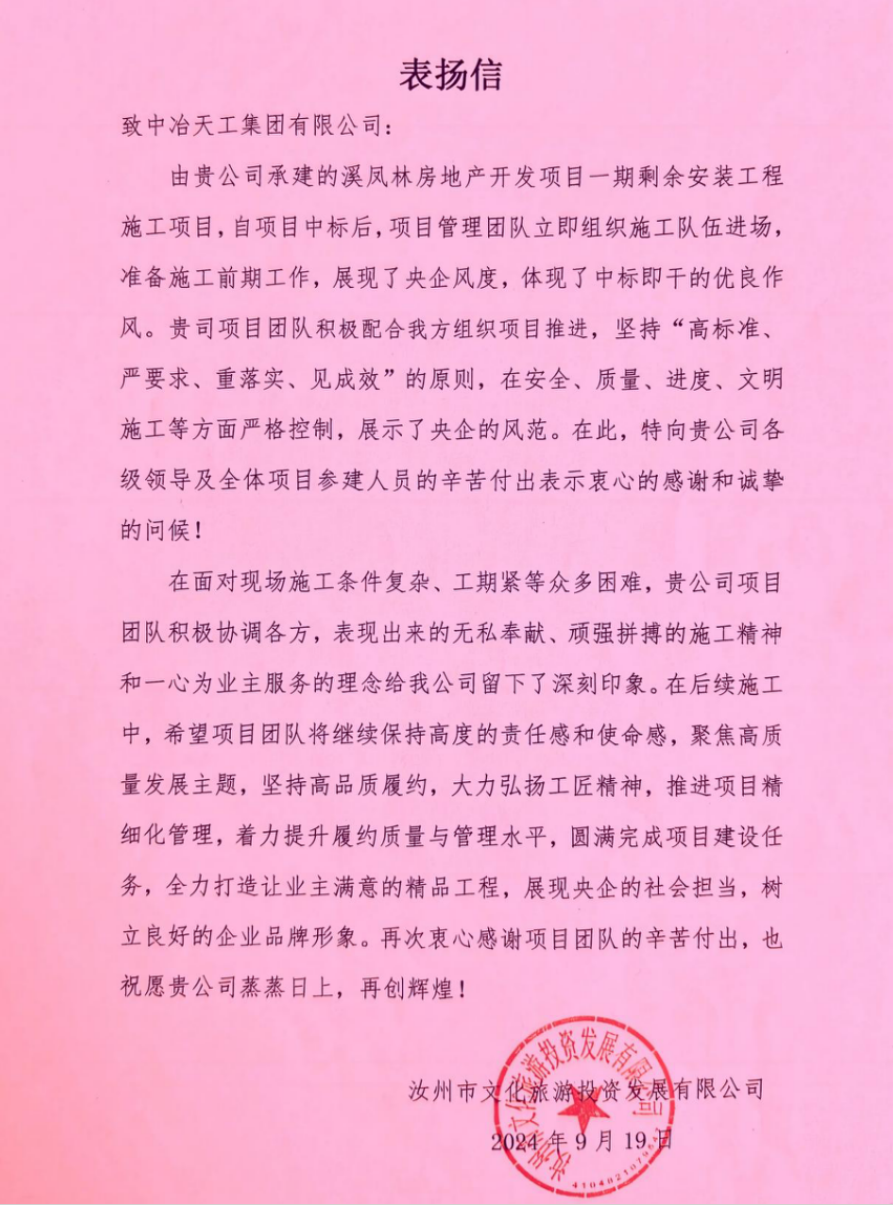 這是一封感謝信,更是一封鞭策信,項目團隊將繼續保持優良的央企施工風范及服務理念,不負所望砥礪前行,以實際行動踐行初心使命,為公司高質量發展貢獻一份力量!