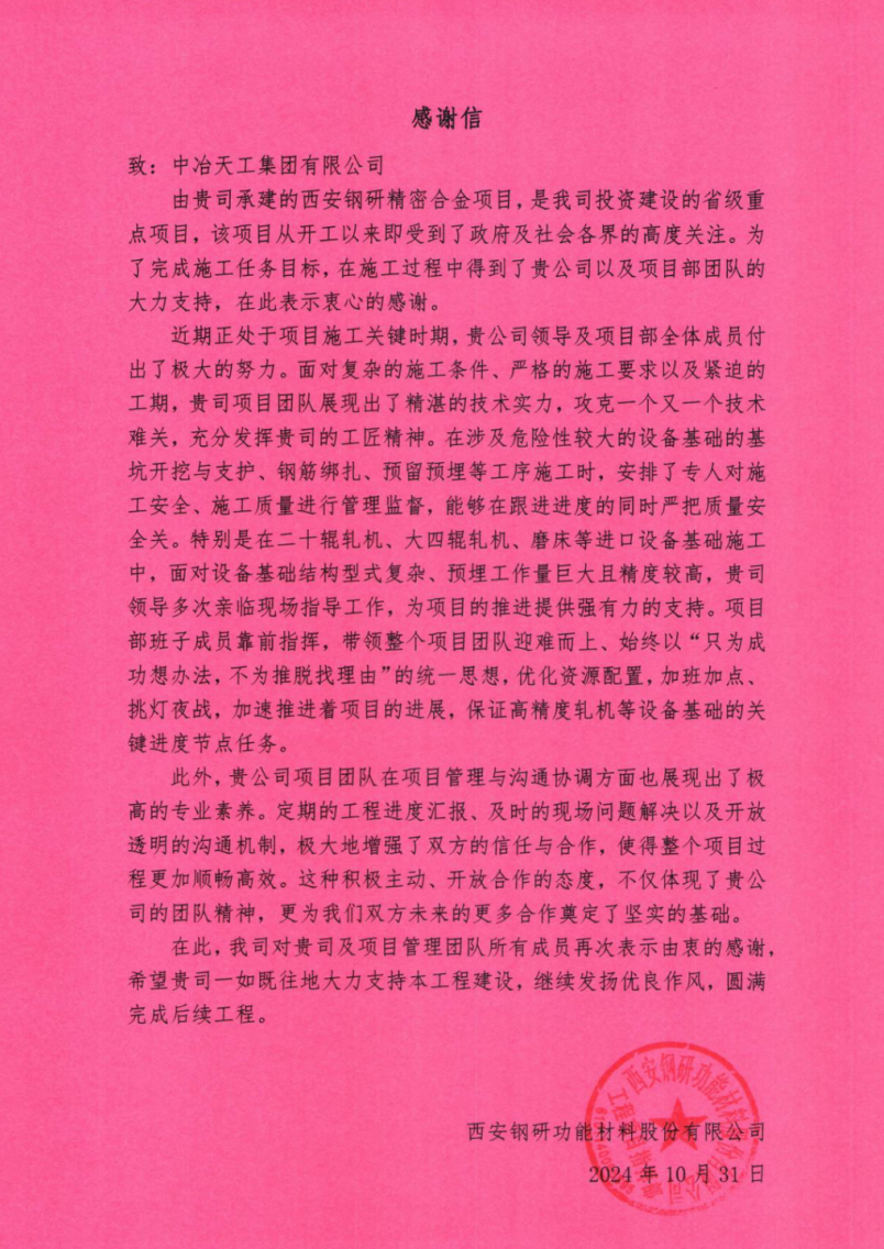西安鋼研精密合金項(xiàng)目,作為省級(jí)重點(diǎn)項(xiàng)目,自開工以來備受政府及社會(huì)各界高度關(guān)注。在項(xiàng)目建設(shè)過程中,工業(yè)工程公司團(tuán)隊(duì)給予了大力支持,近日,業(yè)主特致感謝信表示誠摯謝意。