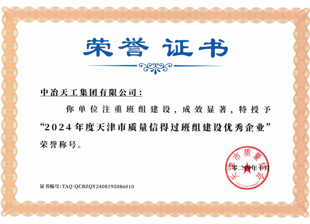 近日,天津市質量協(xié)會表彰了2024年度在推進質量管理先進理念、提升現(xiàn)場質量管理小組活動、班組建設水平三方面中取得優(yōu)秀成果的集體,中冶天工集團有限公司以高度注重班組建設、取得顯著工作成效贏得了天津市建筑業(yè)協(xié)會、天津市質量協(xié)會的一致認可,授予“2024年度天津市質量信得過班組建設優(yōu)秀企業(yè)”榮譽稱號,是中冶天工首次獲得的此類榮譽,進一步肯定了在質量管理工作上取得的成績。