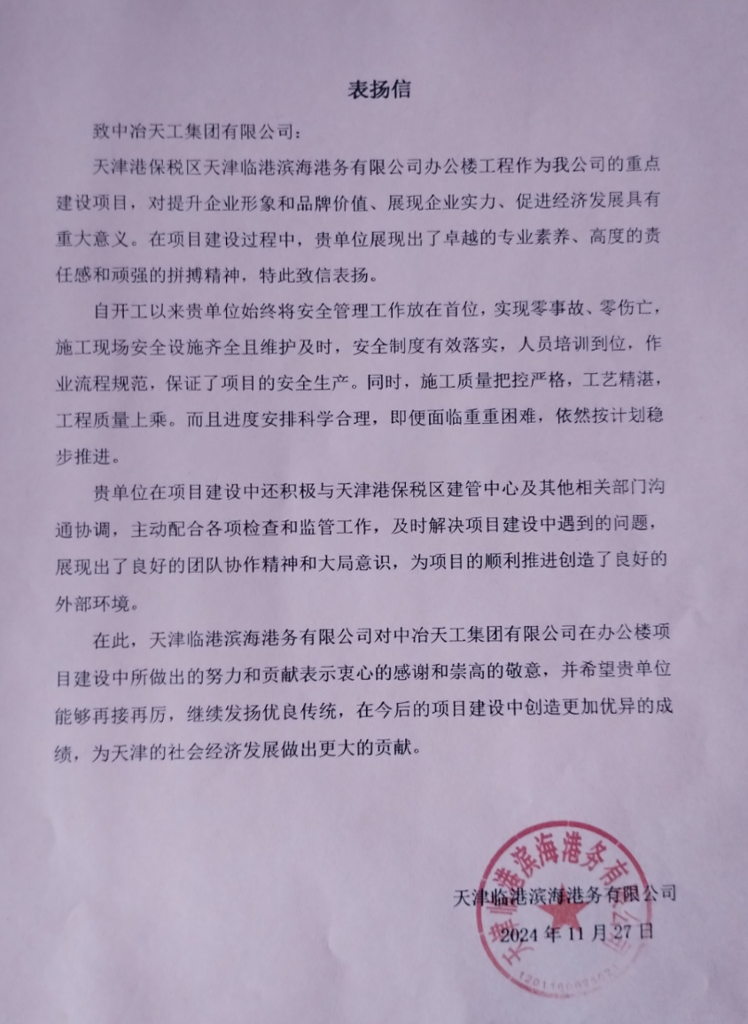 近日,城建公司收到天津臨港濱海港務有限公司表揚信,對項目部付出表示認可和感謝。