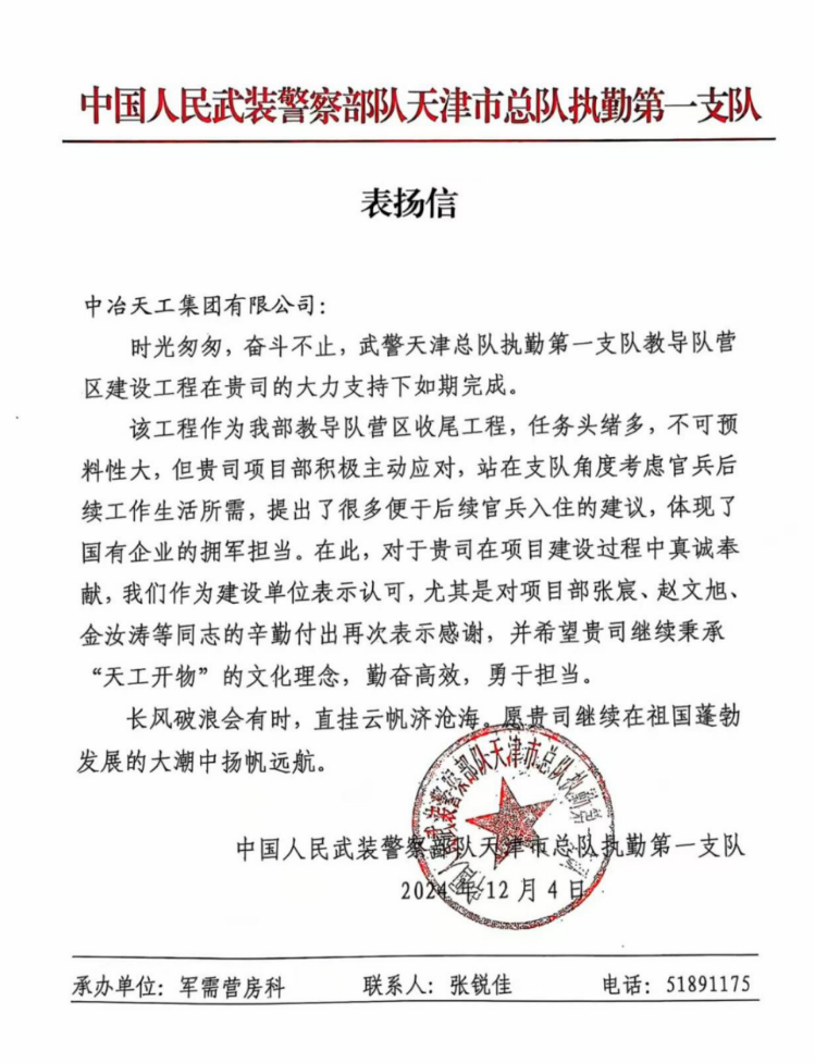 近日,城建公司收到中國人民武裝警察部隊天津市總隊執勤第一支隊的表揚信,對教導隊營區項目攻堅克難保質保量實現工期節點目標的實際行動表示肯定與贊賞。
