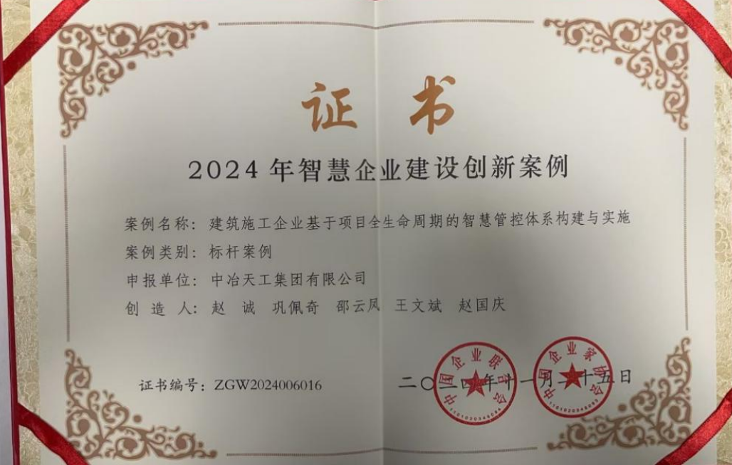 12月5日,中國企業(yè)聯(lián)合會、中國企業(yè)家協(xié)會發(fā)布了“2024 年(第六屆)智慧企業(yè)建設(shè)創(chuàng)新案例”名單,中冶天工申報的《建筑施工企業(yè)基于項目全生命周期的智慧管控體系構(gòu)建與實施》案例入選“行業(yè)融合創(chuàng)新類”標(biāo)桿案例。此榮譽是對中冶天工在智慧企業(yè)建設(shè)領(lǐng)域創(chuàng)新實踐的肯定,也是對推動企業(yè)數(shù)字化、網(wǎng)絡(luò)化、智能化轉(zhuǎn)型升級的認(rèn)可。