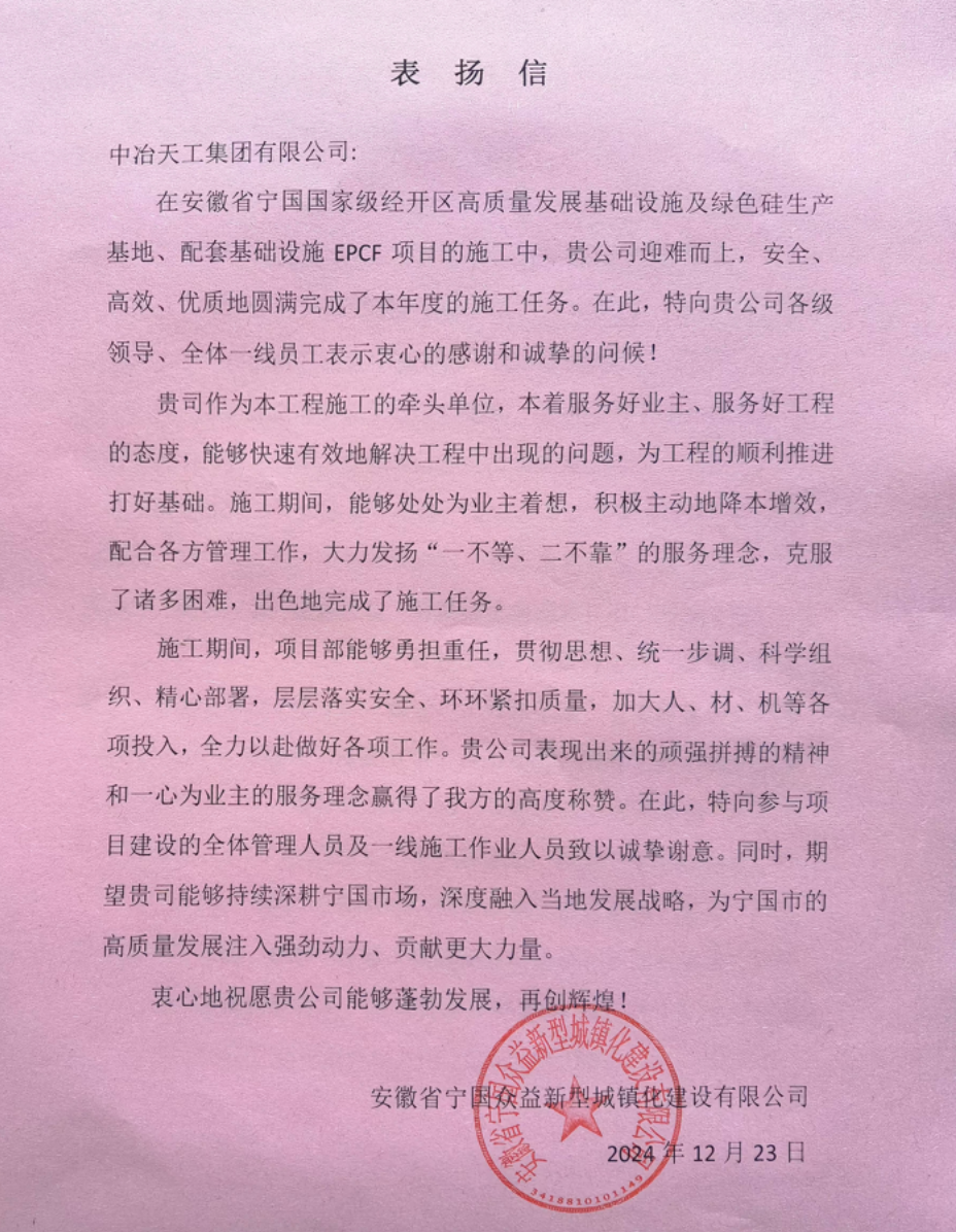 12月25日,安徽公司安徽省寧國國家級經開區高質量發展基礎設施及綠色硅生產基地、配套基礎設施EPCF項目收到業主表揚信,對中冶天工自開工以來迎難而上,安全、高效、優質地完成本年度施工任務給予肯定。