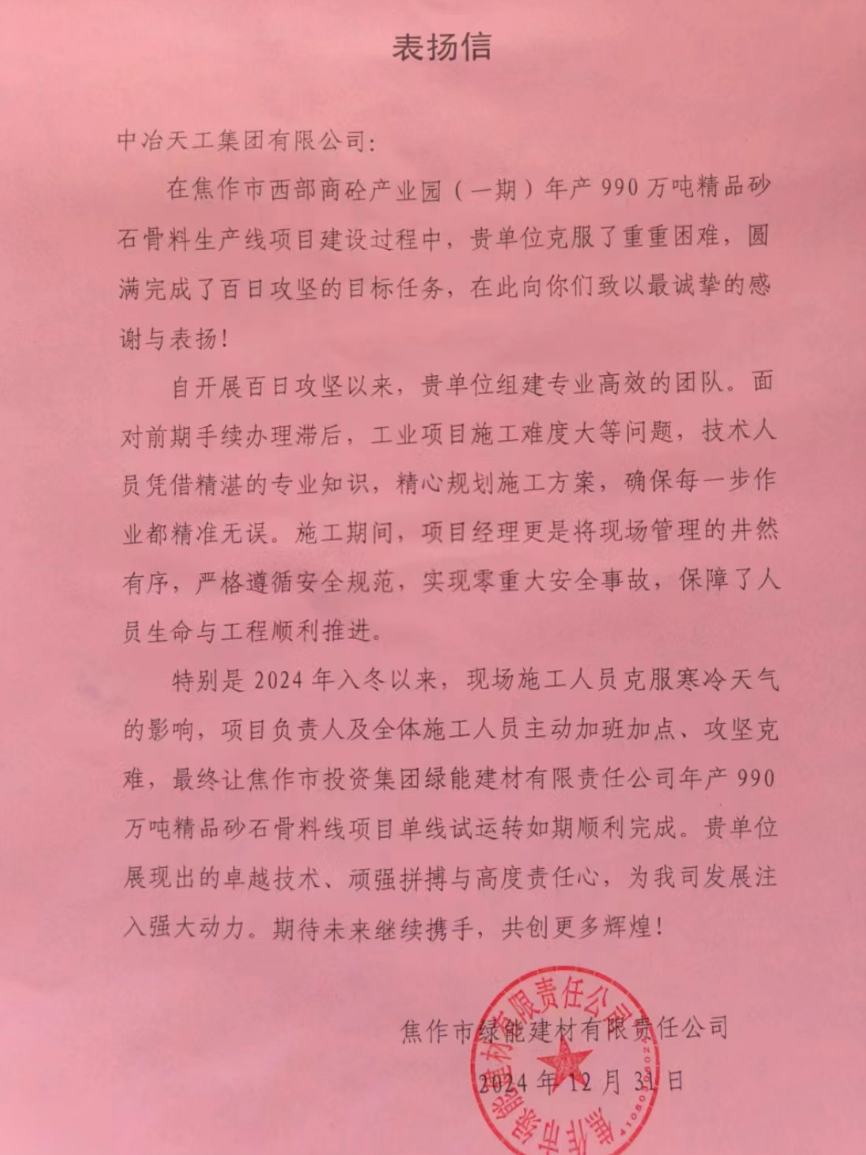 近日,北方公司焦作市西部商砼產(chǎn)業(yè)園項(xiàng)目收到業(yè)主方表揚(yáng)信,信中對項(xiàng)目團(tuán)隊(duì)的卓越工作表現(xiàn)給予了高度評價(jià)和贊揚(yáng)。這封表揚(yáng)信不僅是對項(xiàng)目部團(tuán)隊(duì)工作的認(rèn)可,也是對公司專業(yè)水平和服務(wù)質(zhì)量的肯定。