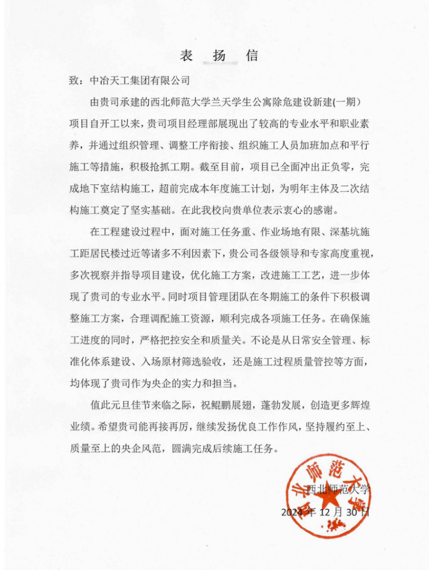 該項目位于甘肅省蘭州市,包括新建學生宿舍樓1棟,分為地上二十四層、地下二層,一類高層公共建筑,總建筑面積60600平方米,同時配套實施綠化、鋪裝、硬化、室外三網等附屬工程。該項目建成后,將極大擴充西北師范大學教育硬件資源,為學生提供舒適、靜謐的生活環境。信中指出,項目管理團隊克服任務繁重、場地狹小、危險性較高等不利因素影響,積極優化施工方案,做好專家論證工作,改進施工工藝,充分調動人、材料、機械資源。在保證質量和安全的前提下,超前完成了本年度施工節點任務。