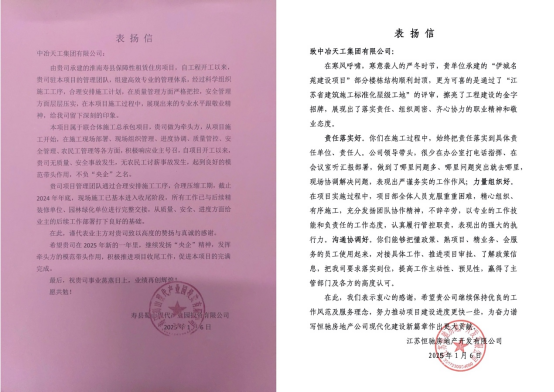 江蘇恒馳房地產開發有限公司在信中指出,中冶天工在施工過程中始終將責任落實到具體單位和人員,尤其在問題多發或突出區域,領導干部扎根一線協調解決問題。展現了嚴謹細致的管理能力,有效保障了工程的順利推進。在寒冬時節,項目部分樓棟順利封頂,并通過了“江蘇省建筑施工標準化星級工地”的評審,贏得了主管部門及各方的高度認可。