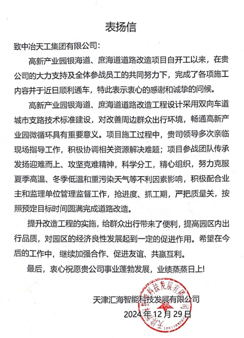 “信”任滿載,實力贏贊!近日,工業工程公司靜海高新產業園銀海道、庶海道道路改造項目收到天津匯海智能科技發展有限公司致中冶天工集團有限公司表揚信。信中對公司承建的高新產業園銀海道、庶海道道路改造項目順利通車表示衷心感謝及誠摯問候。