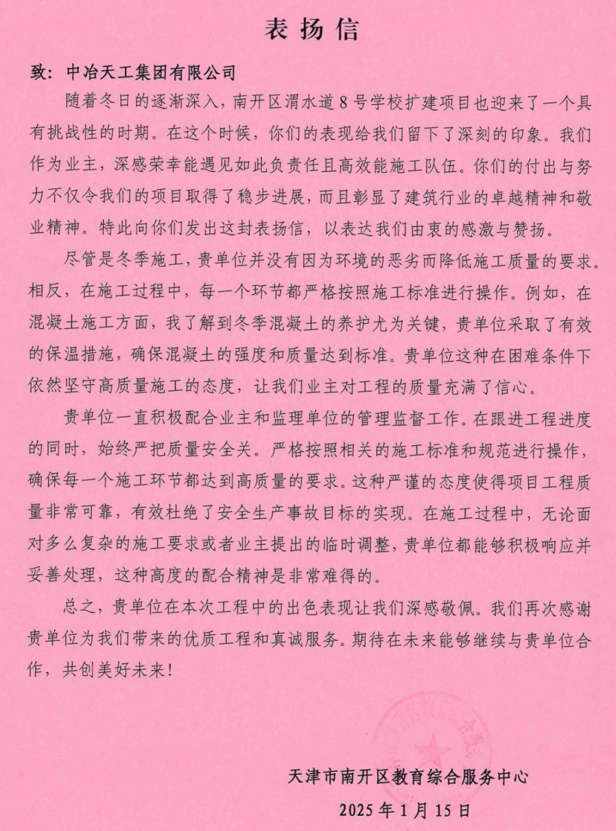 1月15日,開物工程公司南開區(qū)渭水道8號學校擴建項目收到天津市南開區(qū)教育綜合服務(wù)中心發(fā)來的表揚信,對該項目高效施工、精誠協(xié)作及敬業(yè)精神提出表揚,并表達感激之情。