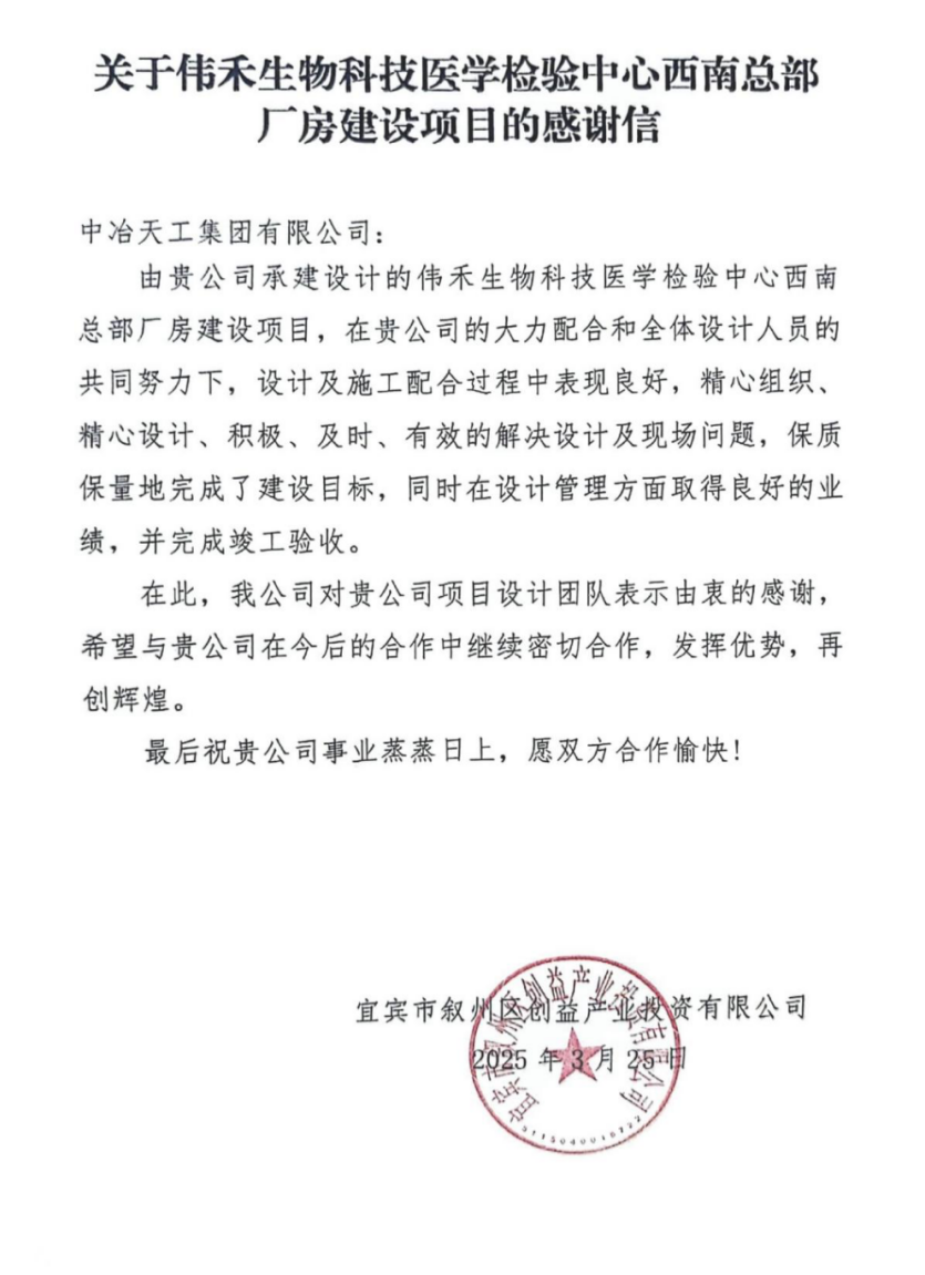 近日,工程技術總院偉禾生物科技醫學檢驗中心西南總部廠房設計項目收到業主宜賓市敘州區創益產業投資有限公司向中冶天工發來的感謝信。信中,業主單位對總院設計團隊的專業能力和優質服務給予了高度評價。