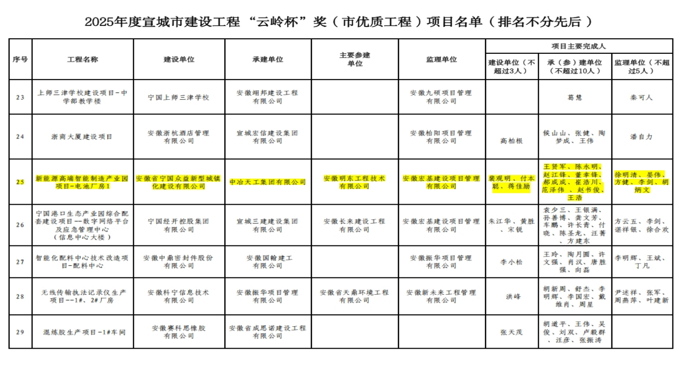 4月21日,在安徽省宣城市公布的2025年度建設工程“云嶺杯”獎項目名單中,由安徽公司承建的安徽省寧國市新能源高端智能制造產(chǎn)業(yè)園項目-電池廠房1工程榮獲2025年度安徽省宣城市建設工程“云嶺杯”獎(市優(yōu)質(zhì)工程)。