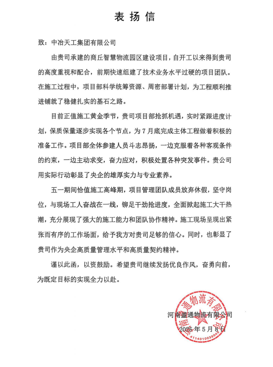 5月8日,中原公司承建的商丘市智慧物流園區建設項目收到建設單位河南盈通物流有限公司發來的表揚信,對中冶天工項目團隊在項目建設過程中展現的專業能力、責任擔當及優質服務給予高度評價,標志著雙方合作再上新臺階。