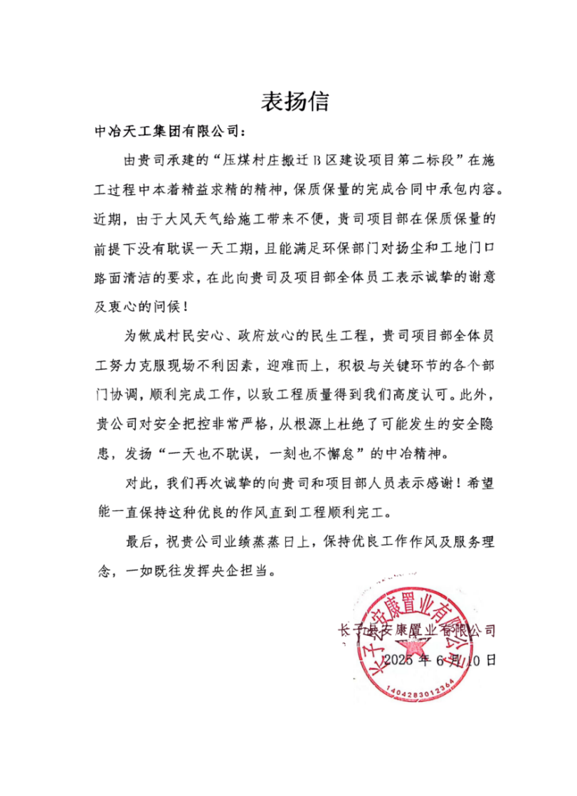 近日,北方公司壓煤村莊搬遷B區建設項目收到業主表揚信,信中對項目團隊在工程建設中的專業水平、高效履約精神及當前項目卓越成果給予了高度評價。