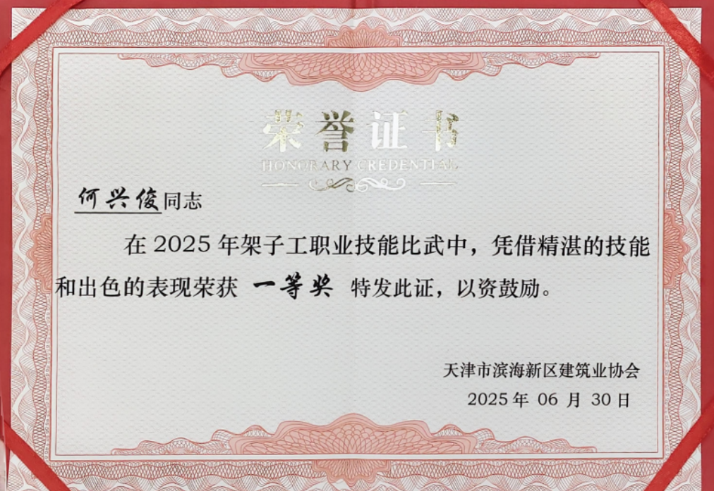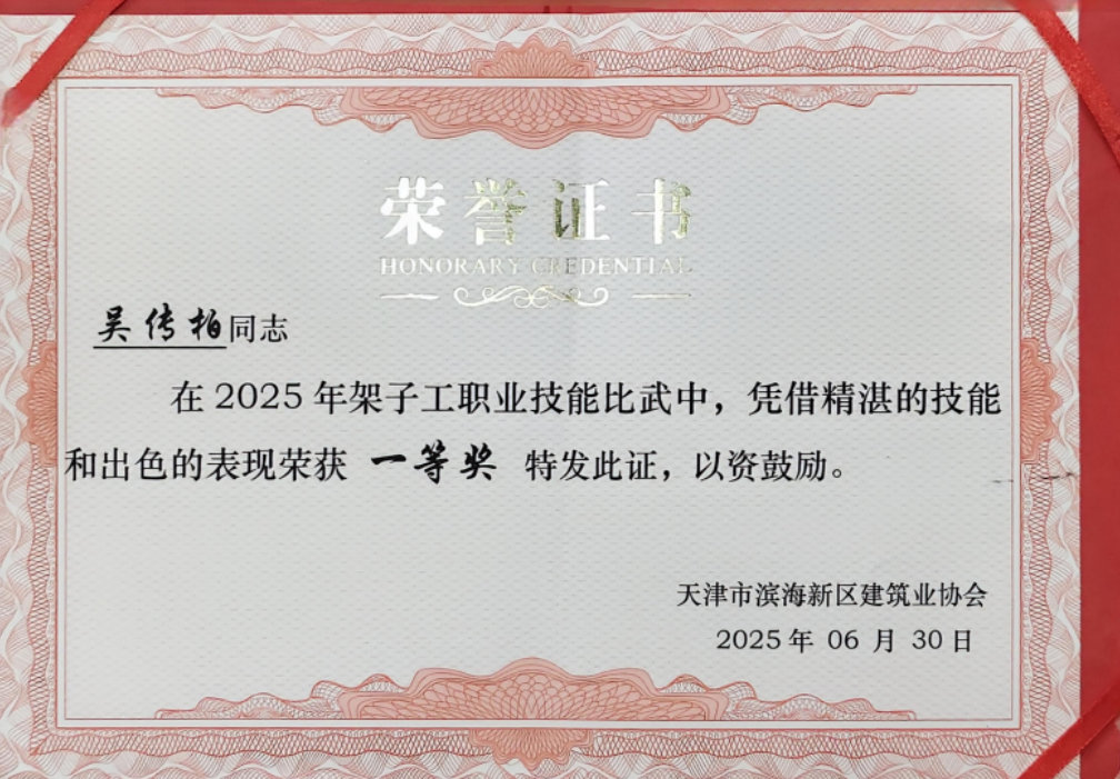近日,華南公司中新天津生態城項目代表中冶天工參加由天津市濱海新區建筑業協會、天津市建設教育培訓中心聯合主辦的2025年架子工職業技能比武大賽,參賽者以精湛技藝與卓越團隊協作,從眾多強勁對手中脫穎而出,一舉奪得團體總成績第一名,并榮獲“技能培育先進單位”稱號,項目兩名架子工同時摘得個人一等獎榮譽。