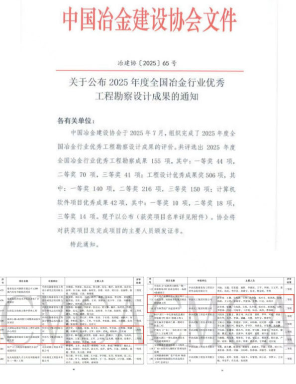 近日,中國冶金建設協會公布了2025年度全國冶金行業優秀工程勘察設計成果評選結果,中冶天工憑借精湛的技術實力與創新設計,一舉斬獲四項二等成果,充分展現了中冶天工在工程勘察設計領域的綜合實力與行業影響力。