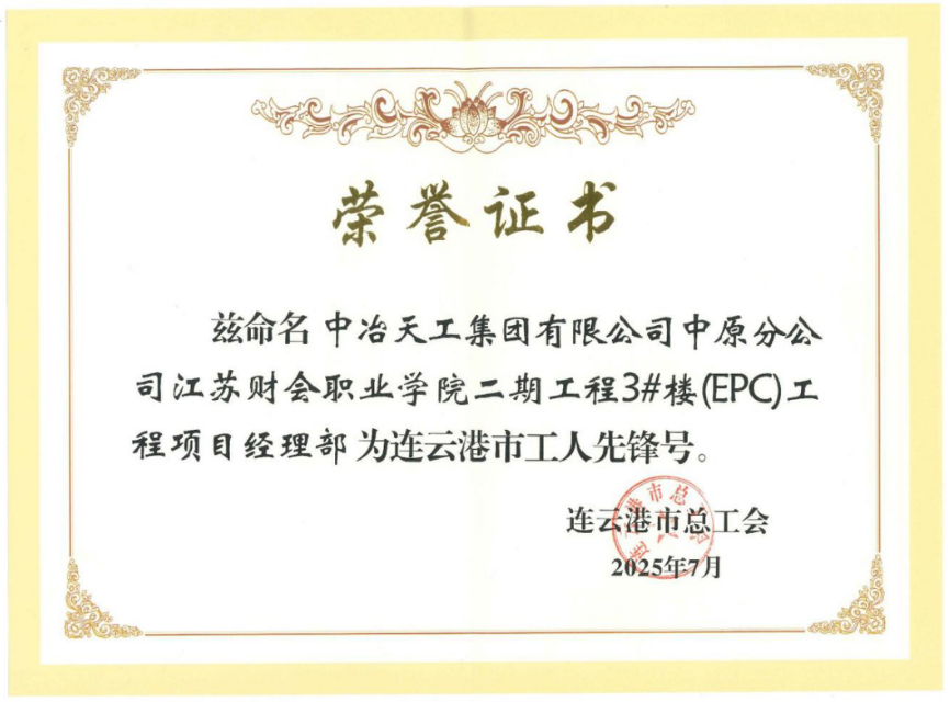 近日,由中冶天工承建的江蘇財(cái)會(huì)職業(yè)學(xué)院項(xiàng)目成功榮獲連云港市總工會(huì)授予的“工人先鋒號(hào)”稱號(hào)。這一榮譽(yù)不僅是對(duì)項(xiàng)目建設(shè)成果的充分肯定,更是對(duì)中冶天工精益建造、追求卓越項(xiàng)目管理的高度認(rèn)可。
