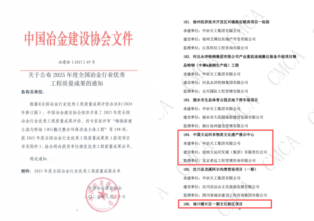 日前,中國冶金建設協會公布了2025年度全國冶金行業優秀工程質量成果獎獲獎名單,天津有限公司南川樓片區一期文化街區項目、中國大運河非物質文化遺產展示中心項目分別上榜,喜獲殊榮。