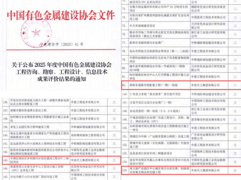 近日,中國有色金屬建設協會正式揭曉2025年度中國有色金屬建設行業優秀工程咨詢、勘察、設計成果獎評選結果。中冶天工憑借卓越的創新設計能力,取得一項二等獎和兩項三等獎的優異成績。本次獲獎充分展現了中冶天工在規劃設計領域的技術實力和綜合能力,通過精品工程的示范效應,為企業實現高質量發展奠定了堅實的業績基礎、打造了品牌優勢。