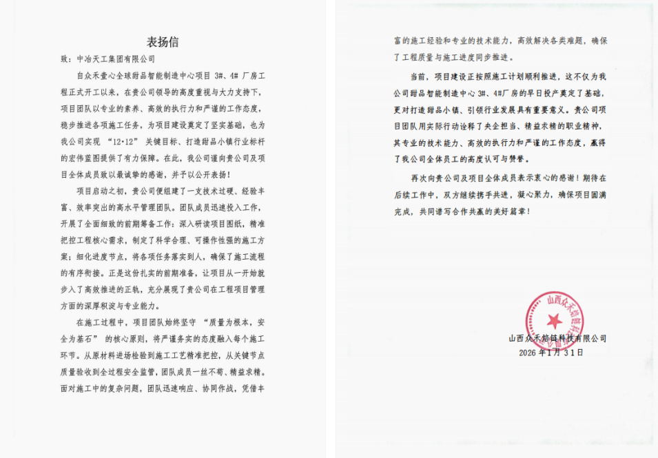 1月31日,中原公司承建的眾禾壹心全球甜品智能制造中心項目收到業主表揚信。信中對中冶天工各項工作的穩步推進和項目團隊專業高效的施工管理與精益求精的建造態度給予了高度評價與充分贊揚。