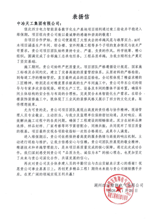 近日,中原公司浙江湖州四方電力智能裝備數字化生產基地項目收到了業主發來的表揚信。信中對項目團隊秉持專業嚴謹、務實擔當的工作作風,以精益求精的匠心圓滿完成施工任務,并推動項目平穩進入維保階段表達了真摯的感謝。