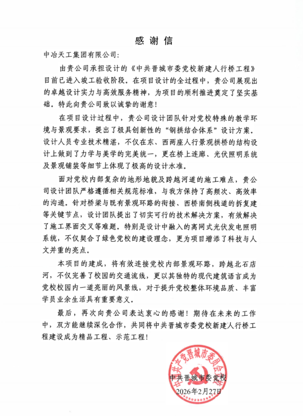 近日,工程技術總院中共晉城市委黨校新建人行橋工程設計項目收到業主發來的感謝信。信中,業主單位對設計團隊的高品質服務給予高度評價。