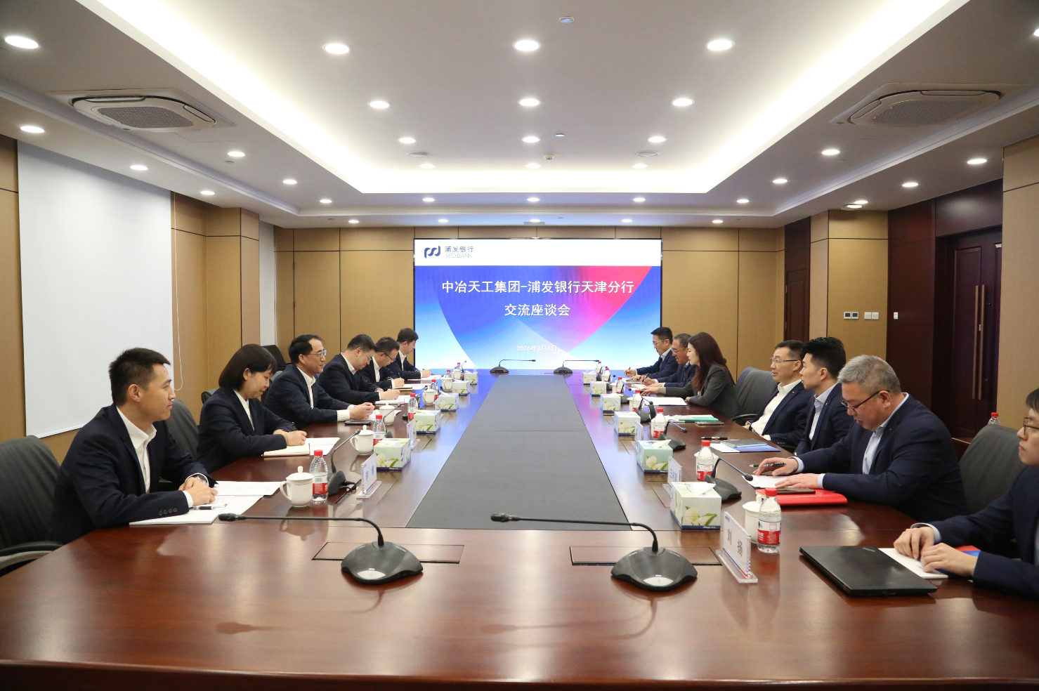 浦發(fā)銀行天津市分行黨委委員、副行長劉靜瑤、公司業(yè)務(wù)部總經(jīng)理宋凡、和平業(yè)務(wù)發(fā)展部總經(jīng)理李明、和平業(yè)務(wù)發(fā)展部副總經(jīng)理王向軍、交易銀行部供應(yīng)鏈融資團隊經(jīng)理劉揚、浦安支行客戶部經(jīng)理高喆;中冶天工委派總會計師阮斯蕓以及相關(guān)人員代琨、馮志文等共同參加會談。