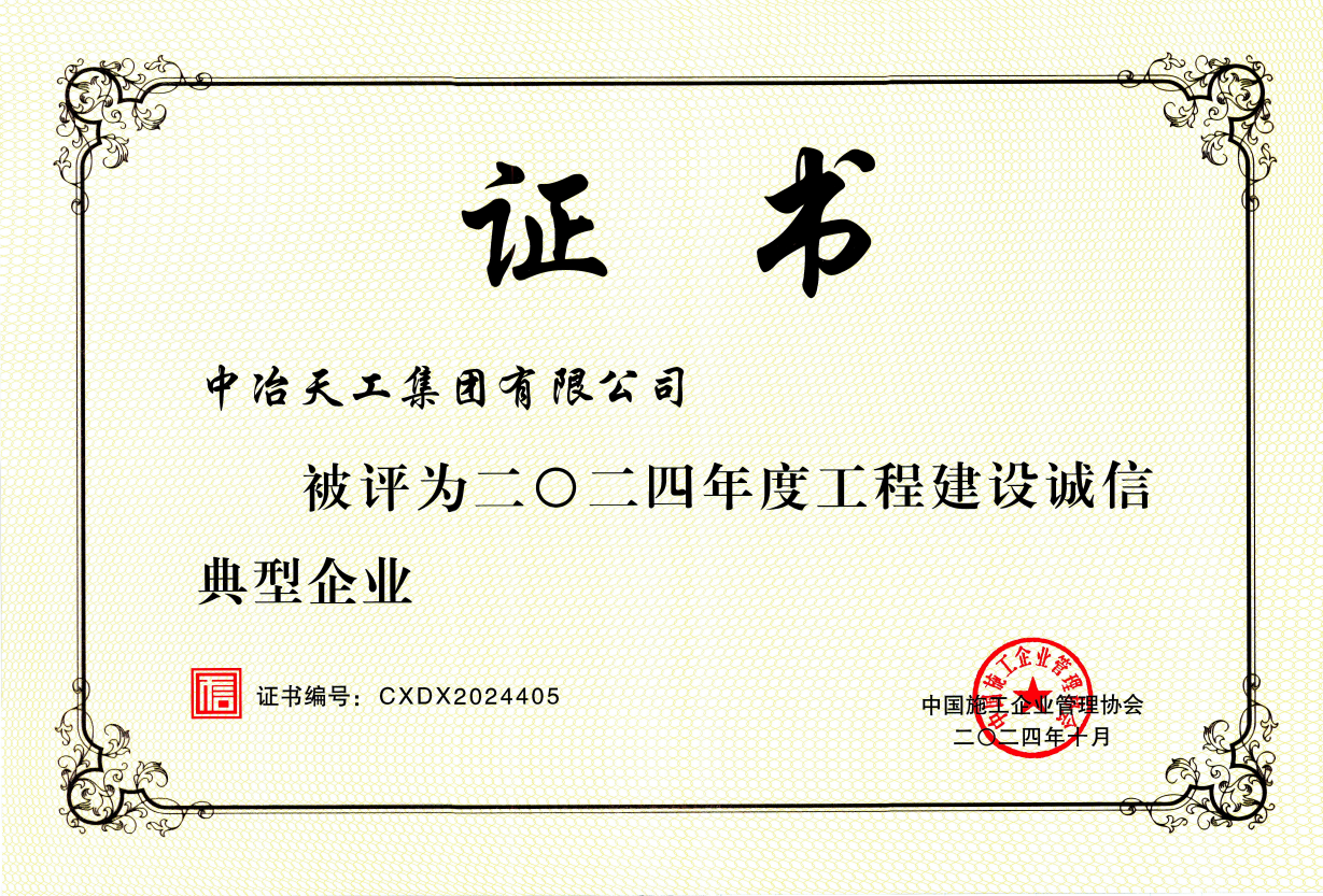中国施工企业管理协会2024年度诚信典型单位(中冶天工)